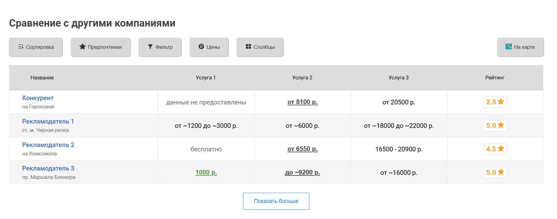 Вокруг продвигаемого таким образом агентства выбирается некоторое количество ближайших конкурирующих агентств, продвигаемое агентство попадёт к ним в таблицу «Сравнение по ценам», которая выглядит следующим образом: